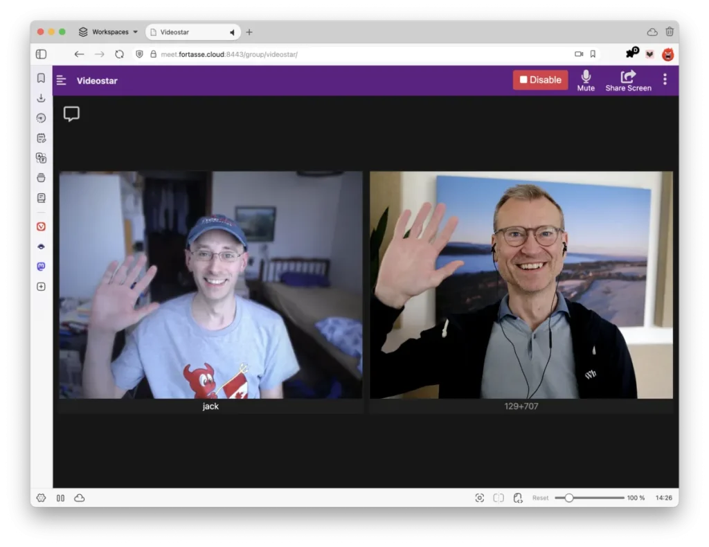 In the same line, you can find the default port 8443 that Galene is listening on for incoming connections. Assuming our hostname is videostar.example, we can enter this in our browser URL bar: https://videostar.example:8443